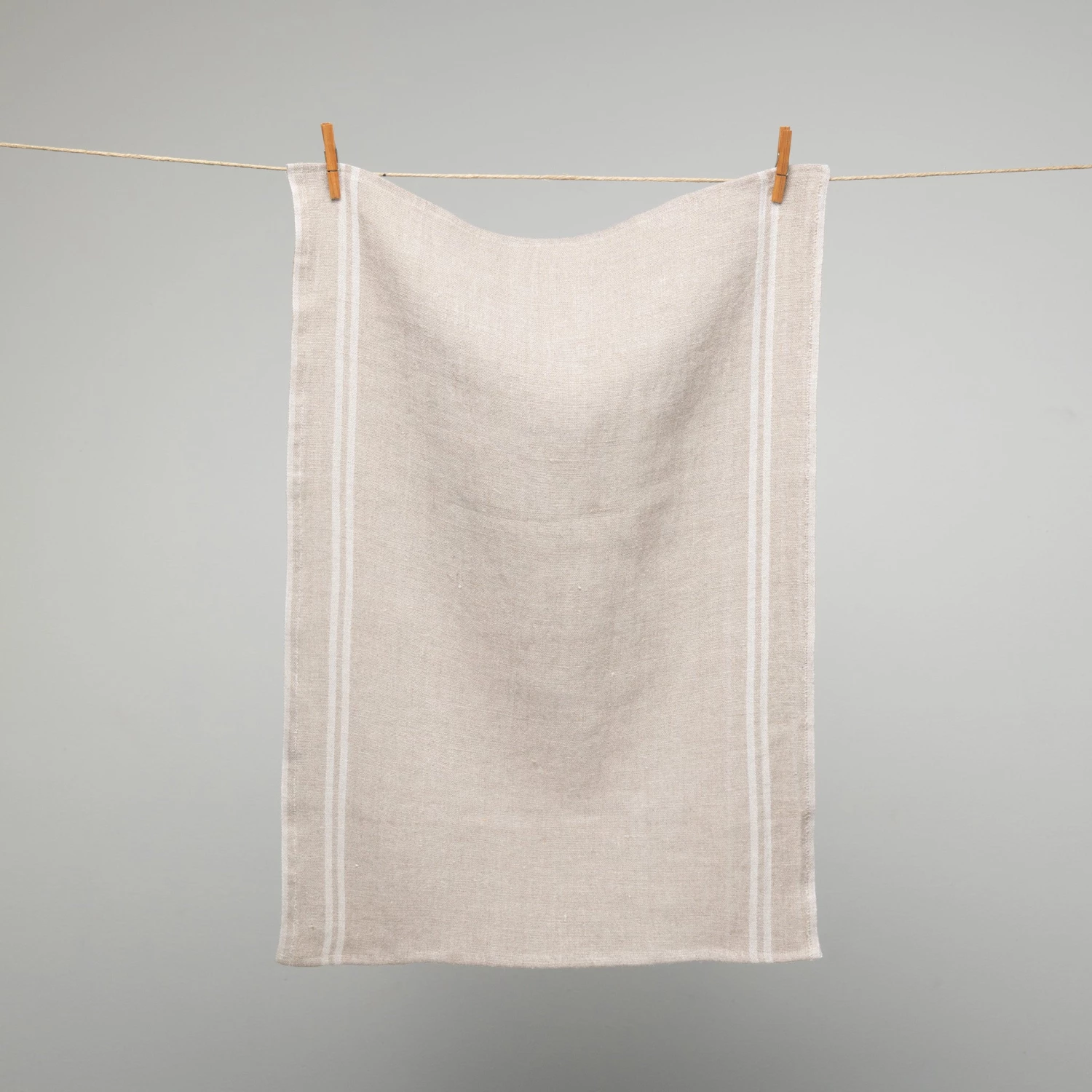 Beautiful French tea towels in natural featuringĀ four white stripes.