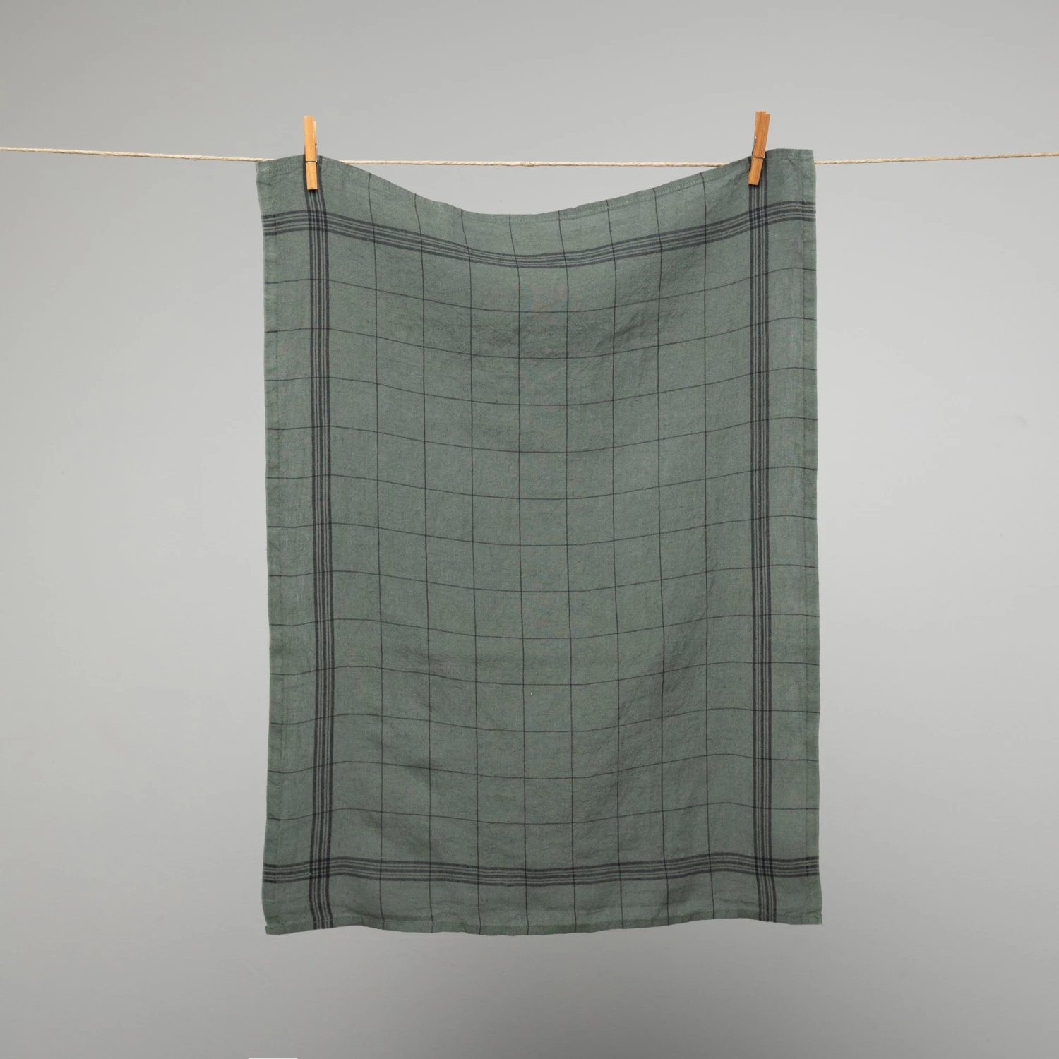 Beautiful French tea towels in a washed green Rosemary colourway featuring black graph check.