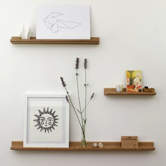 An oak ledge suitable for any number of uses around the home; framed prints and photographs, picture books and toys, herbs and spices, make-up and car keys.