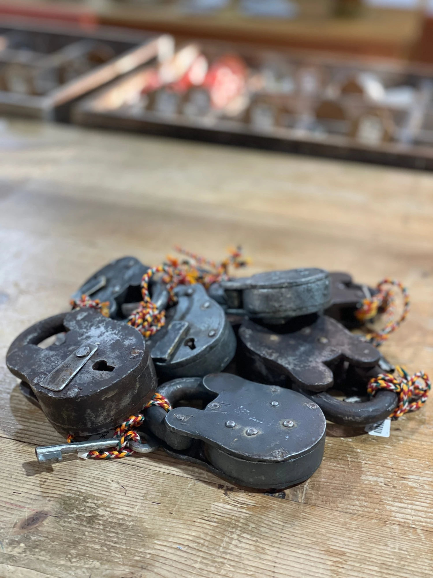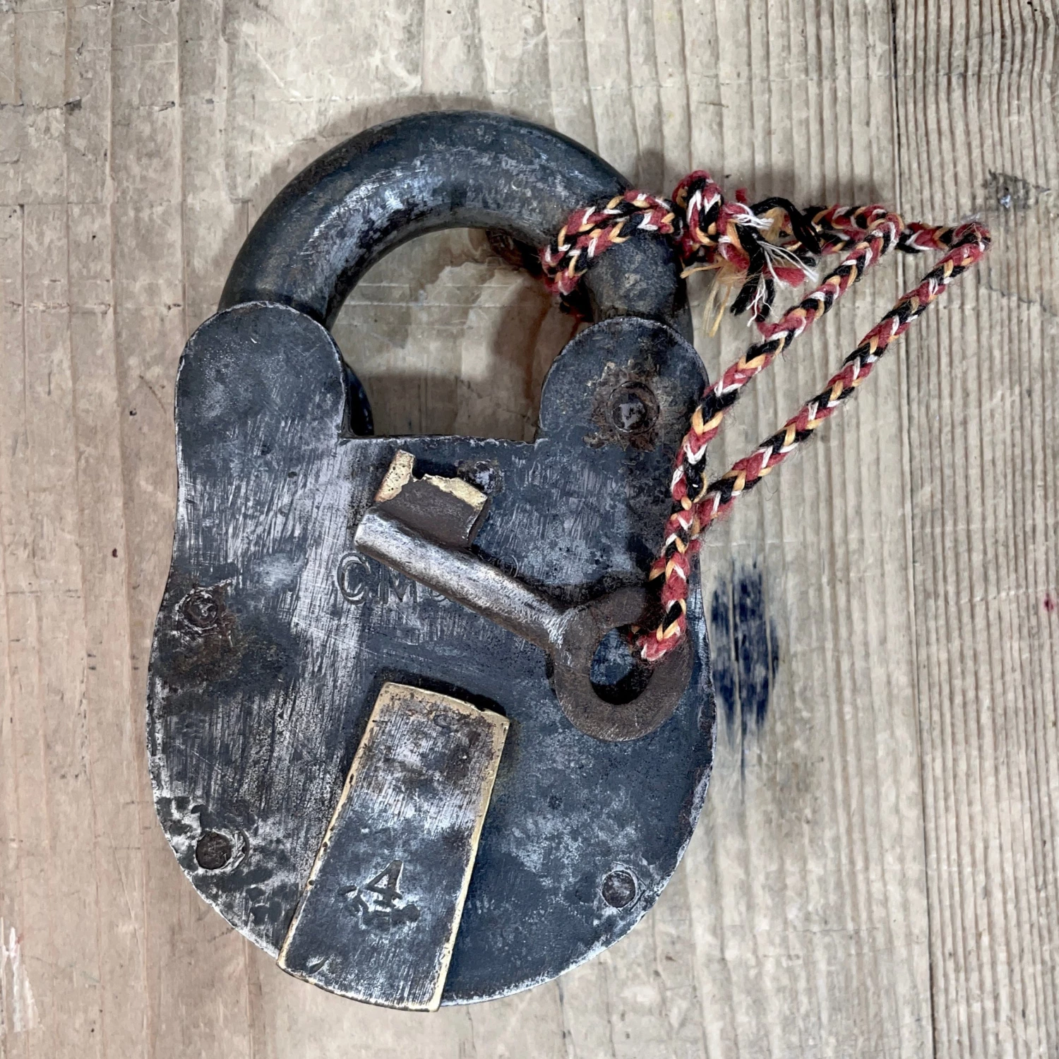 Beautifully weighted and vintage wrought iron trunk chest style box padlock and key.