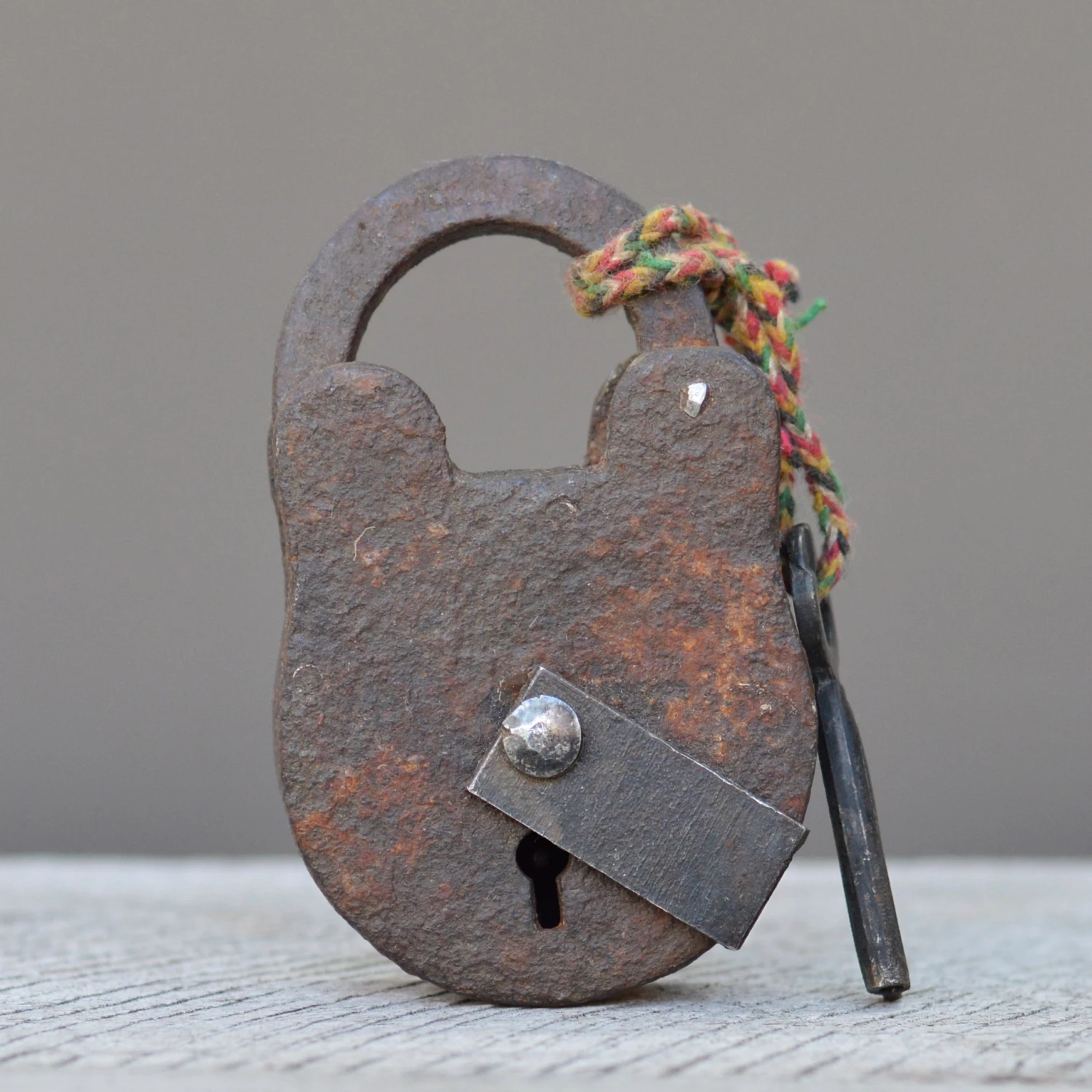 Beautifully weighted and vintage wrought iron trunk chest style box padlock and key.