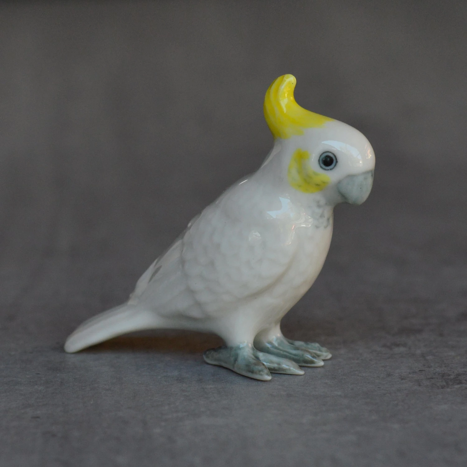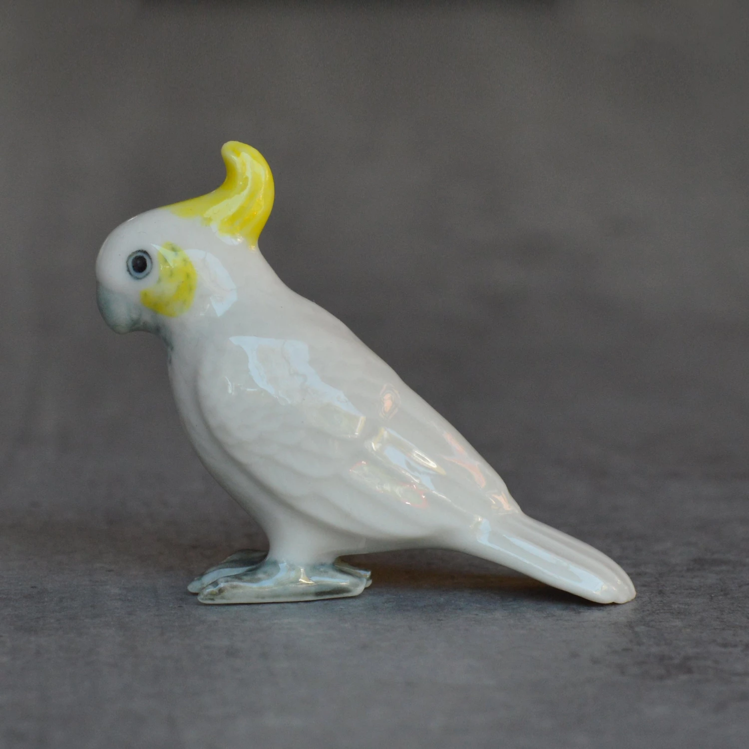 Cute little ceramic and hand painted miniature cockatoo figurine. Perfect for little gardens and shelves.