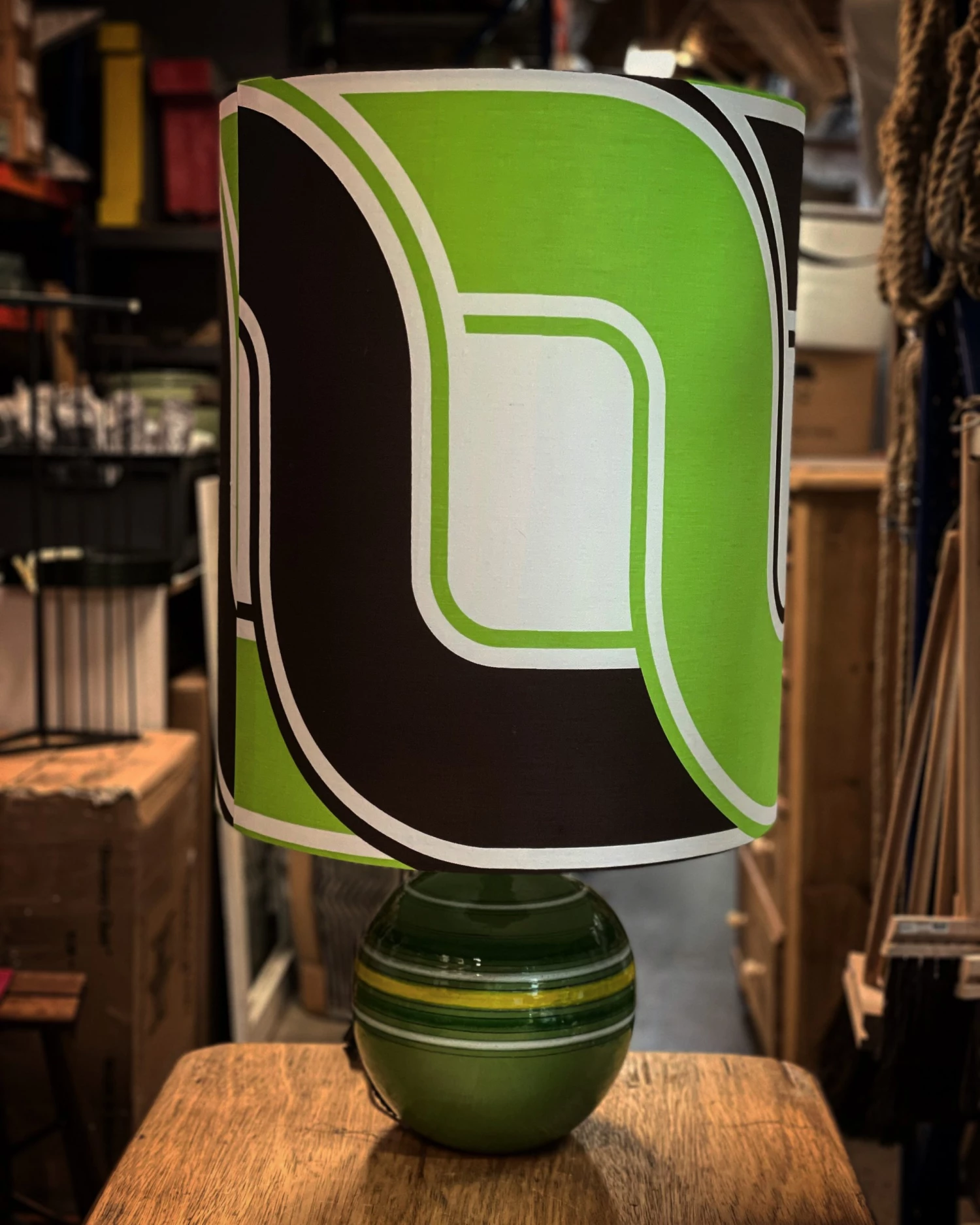 Original Bitossi base matched with a 1960’s vintage Oversized Geometric Fabric shade.Â