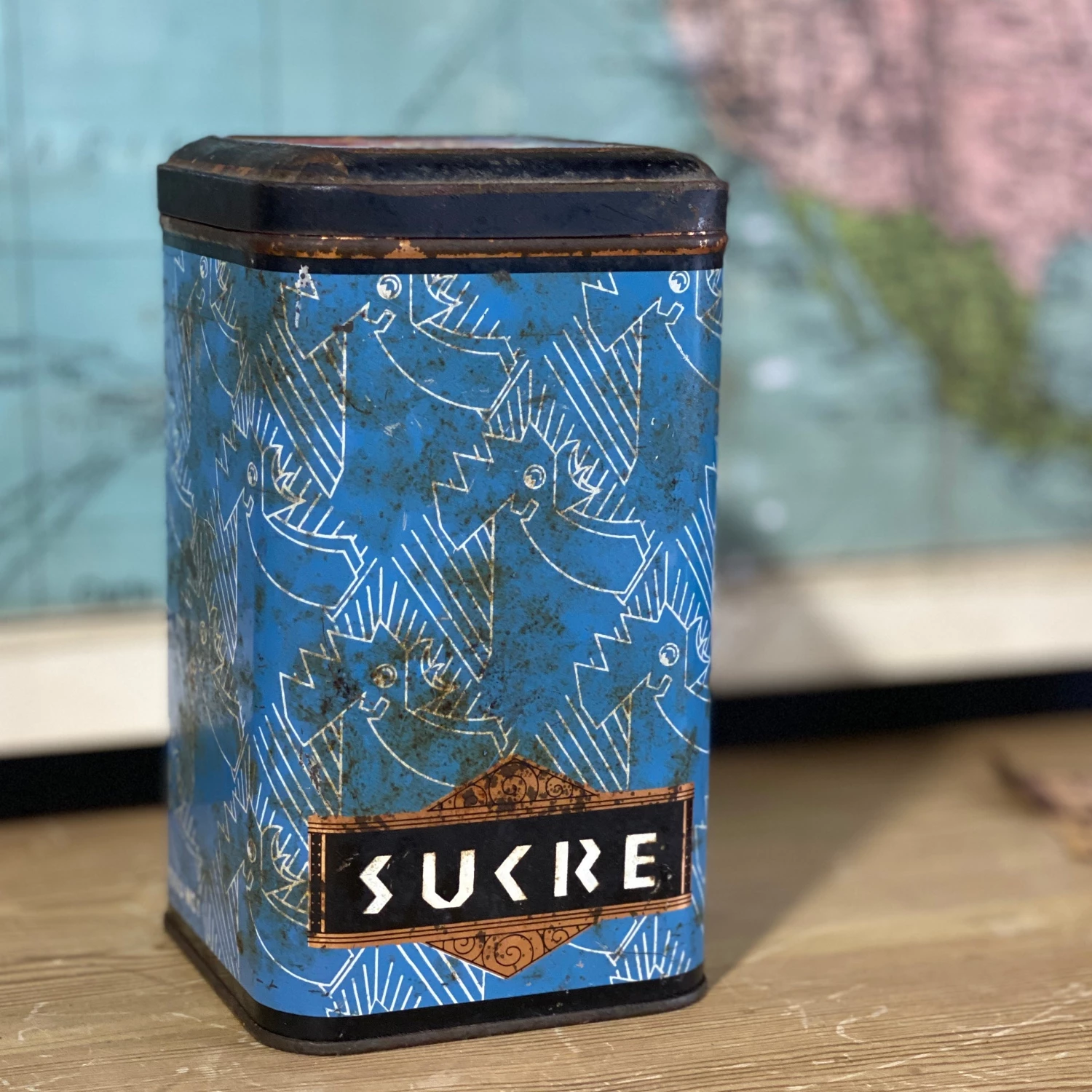 This vibrant vintage French Tin measures 19cm x 10cm x 10cm.